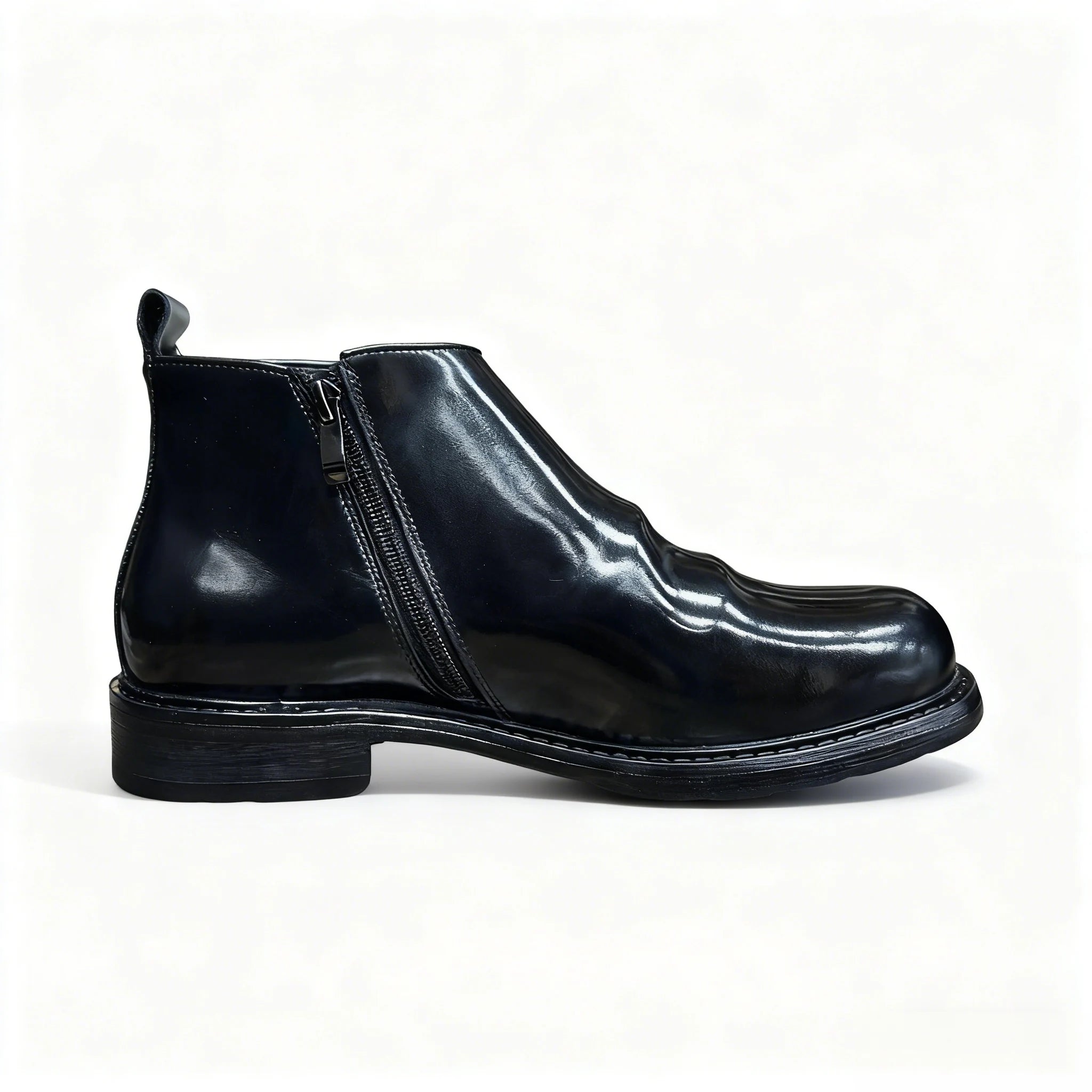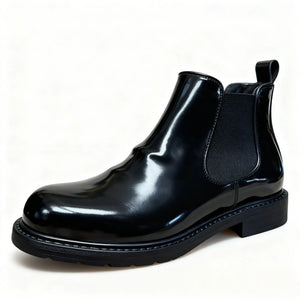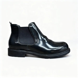 High-shine full-grain leather that starts out mirror smooth and slowly builds creases and character. It’s the kind of black that looks “too clean” on day one and just gets more interesting the more nights you take it out.